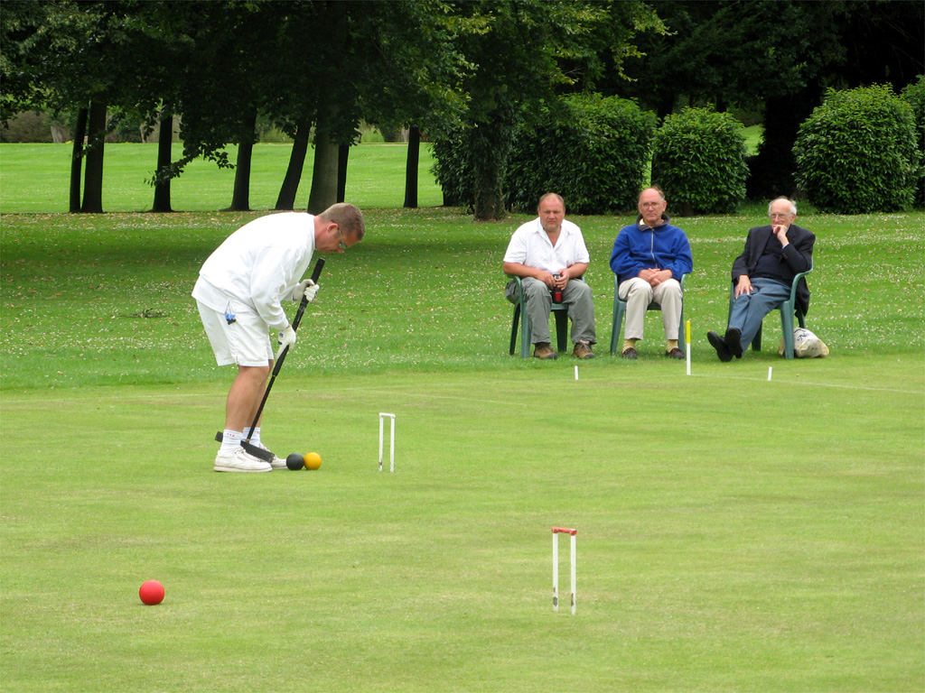 Jonathan Hills (one of the part-timers) played a remarkable shot on the Saturday afternoon: hampered after running 2-back he felt constrained to play the next shot lying flat on his back (feet pointing towards 3-back) with the mallet held somewhere over his left shoulder. Quite why he did this is not entirely clear: something to do with being the only way he could see the point of contact between mallet and ball. Earlier in the day Neil Chalmers had been using his mallet as a back-scratcher (not during the striking period, I hasten to add). Both incidents had spectators scrambling for cameras and camera-phones but unfortunately no-one was quick enough to record either incident for posterity. On the Sunday Georgeen Hemming achieved a remarkable double, winning both her games on a "Golden Hoop". Greatest number of games was played by George Woolhouse, playing no fewer than 10 over the three days.